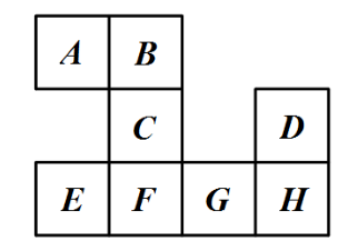 八张标有 $A, B, C, D, E, F, G, H$ 的正方形卡片构成下图.现逐一取走这些卡片,要求每次取走一张卡片时,该卡片与剩下的卡片中至多一张有公共边(例如可按 $D, A, B, E, C, F$, $G, H$ 的次序取走卡片,但不可按 $D, B, A, E, C, F, G, H$的次序取走卡片),则取走这八张卡片的不同次序的数目为