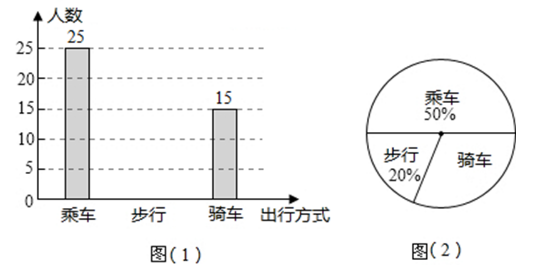 某中学七(4)班一位学生针对七年级同学上学 “出行方式” 进行了一次调查. 图(1) 和图(2) 是他根据采集的数据绘制的两幅不完整的统计图,请根据图中提供的信息解答以下问题: