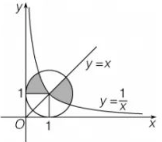 在平面直角坐标系 $x-O-y$ 中画有函数 $y=x$ 和 $y=\frac{1}{x}$的图象以及以点 ( 1 , 1) 为圆心半径为 1 的圆, 如图 1 所示. 则图中两块阴影部分的面积之和为