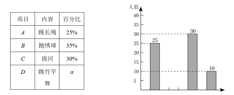 某校将举办的 “壮乡三月三” 民族运动会中共有四个项目: $A$ 跳长绳, $B$ 抛绣球, $C$ 拔河, $D$ 跳竹竿舞. 该校学生会围绕 “你最喜欢的项目是什么? ”在全校学生中进行随 机抽样调查 (四个选项中必选且只选一项), 根据调查统计结果, 绘制了如下两种不完整的 统计图表: