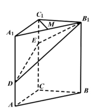 如图, 在三棱柱 $A B C-A_{1} B_{1} C_{1}$ 中, $C C_{1} \perp$ 平面 $A B C, A C \perp B C, A C=B C=2, C C_{1}=3$, 点 $D, E$ 分别在棱 $A A_{1}$ 和棱 $C C_{1}$ 上, 且 $A D=1 \quad C E=2, M$ 为棱 $A_{1} B_{1}$ 的中点.