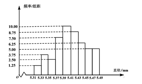 $[5.31,5.33),[5.33,5.35), \cdots,[5.45,5.47],[5.47,5.49]$, 并整理得到如下频率分布直方图, 则在被抽取的零 件中, 直径落在区间 $[5.43,5.47)$ 内的个数为()