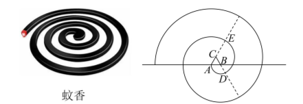 蚊香具有悠久的历史, 我国蚊香的发明与古人端午节的习俗有关.如图为某校数学社团用数学软件制作的“蚊香”. 画法如下: 在水平直线上取长度为 1 的线段 $A B$, 作一个等边三角形 $A B C$, 然后以点 $B$ 为圆心, $A B$ 为半径逆时针画圆弧交线段 $C B$ 的延长线于点 $D$ (第一段圆弧), 再以点 $C$为圆心, $C D$ 为半径逆时针画圆弧交线段 $A C$ 的延长线于点 $E$, 再以点 $A$ 为圆心, $A E$ 为半径逆时针画圆弧以此类推,当得到的“蚊香”恰好有 15 段圆弧时, “蚊香”的长度为