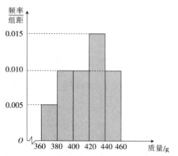 已知某种业公司培育了新品种的软籽石榴, 从收获的果实中随机抽取了 50 个软籽石榴,按质量(单位: $\mathrm{g}$ ) 将它们分成 5 组: $[360,380),[380,400),[400,420),[420,440),[440,460]$,得到如下频率分布直方图.