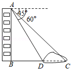 如图, 从楼顶 $A$ 处看楼下荷塘 $C$ 处的俯角为 $45^{\circ}$, 看楼下荷塘 $D$ 处的俯角为 $60^{\circ}$, 已知楼高 $A B$ 为 30 米, 则荷塘的宽 $C D$ 为多少米 (结 果保留根号).