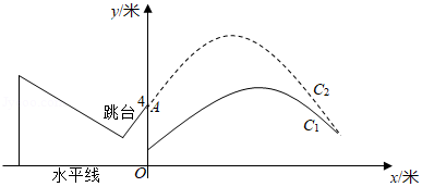 (1) 当运动员运动到离 $A$ 处的水平距离为 4 米时, 离水平线的高度为 8 米, 求抛物线 $C_{2}$ 的函数解析式 (不要求写出自变量 $x$ 的取值范围);