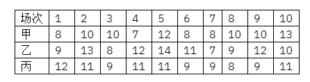 甲、乙、丙三人进行投篮比赛, 共比赛 10 场, 规定每场比赛分数最高者获胜, 三人得分 (单位: