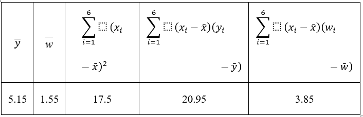 其中 $\bar{w}=\frac{1}{6} \sum_{i=1}^6 w_i, w_i=\ln y_i, \mathrm{e}^{2.44} \approx 11.47, \mathrm{e}^{2.54} \approx 12.68$.