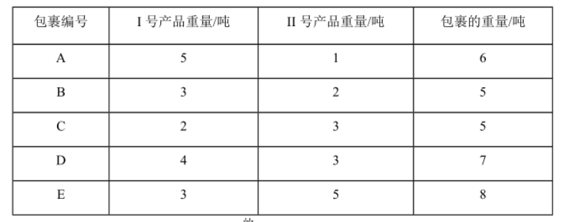 (2) 如果装运的 I 号产品不少于 9 吨, 且不多于 11 吨, 同时装运的 II 号产品最多, 写出满足条件的装运 方案 (写出要装运包衰的编号).