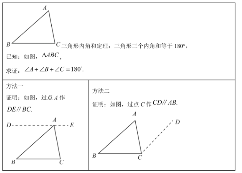 下面是证明三角形内角和定理的两种添加辅助线的方法, 选择其中一种, 完成证明.