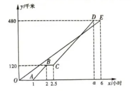 甲、乙两地相距 480 千米,一辆货车和一辆轿车先后从甲地出发驶向乙地 (两车行驶过程中速度均保持不变).如图,折线 $A B C D$ 表示轿车离甲地的距离 $y$ (单位:千米)与时间 $x$ (单位:小时) 之间的函数关系,线段 $O E$ 表示货车离甲地的距离 $y$ (单位:千米)与时间 $x$ (单位:小时)之间的函数关系,请你根据图象信息,解答下列问题: