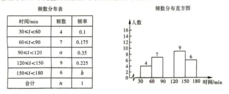 某校在九年级学生中随机抽取了若干名学生参加“平均每天体育运动时间” 的调查, 根据调查告果绘制了如下不完整的频数分布表和频数分布直方图.