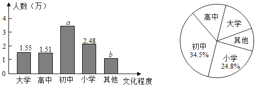 根据 2021 年 5 月 11 日国务院新闻办公室发布的《第七次全国人口普查公报》, 就我国 2020年每 10 万人中, 拥有大学 (指大专及以上)、高中 (含中专)、初中、小学、其他等文化 程度的人口(以上各种受教育程度的人包括各类学校的毕业生、肄业生和在校生)受教 育情况数据, 绘制了条形统计图 (图 1) 和扇形统计图 (图 2).