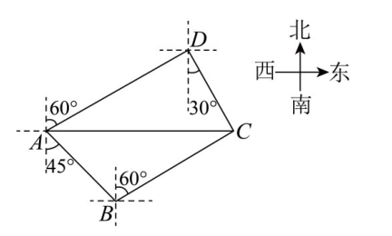 如图,甲、乙两艘货轮同时从 $A$ 港出发,分别向 $B , D$ 两港运送物资,最后到达 $A$ 港正东方向的 $C$ 港装运新的物资. 甲货轮沿 $A$ 港的东南方向航行 40 海里后到达 $B$ 港,再沿北偏东 $60^{\circ}$ 方向航行一定距离到达 $C$ 港. 乙货轮沿 $A$ 港的北偏东 $60^{\circ}$ 方向航行一定距离到达 $D$ 港,再沿南偏东 $30^{\circ}$ 方向航行一定距离到达 $C$港. (参考数据: $\sqrt{2} \approx 1.41 , \sqrt{3} \approx 1.73 , \sqrt{6} \approx 2.45$ )