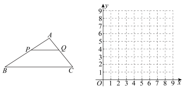 如图, 在 $\triangle A B C$ 中, $A B=6, B C=8$, 点 $P$ 为 $A B$ 上一点, 过点 $P$ 作 $P Q / / B C$ 交 $A C$ 于点 $Q$. 设 $A P$的长度为 $x$, 点 $P, Q$ 的距离为 $y_1, \triangle A B C$ 的周长与 $\triangle A P Q$ 的周长之比为 $y_2$.