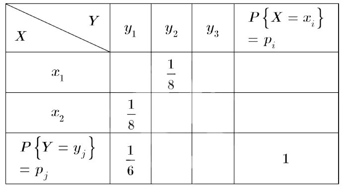 设随机变量 $\boldsymbol{X}$ 和 $\boldsymbol{Y}$ 相互独立,下表列出了二维随机变量 $(X, Y)$ 联合分布律及关于 $X$ 和关于 $Y$ 的边缘分布中的部分数值,试将其余数值填入表中的空白处.