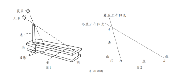 圭表(如图 1) 是我国古代一种通过测量正午日影长度来推定节气的天文仪器, 它包括一根直立的标竿(称为 “表”)和一把呈南北方向水平固定摆放的与标竿垂直的长尺(称为 “圭”), 当正午太阳照射在表上时, 日影 便会投影在圭面上, 圭面上日影长度最长的那一天定为冬至, 日影长度最短的那一天定为夏至. 图 2 是一个根据 某市地理位置设计的圭表平面示意图, 表 $A C$ 垂直圭 $B C$, 已知该市冬至正午太阳高度角(即 $\angle A B C$ )为 $37^{\circ}$, 夏至正午太阳高度角 (即 $\angle A D C$ )为 $84^{\circ}$, 圭面上冬至线与夏至线之间的距离(即 $D B$ 的长)为 4 米.