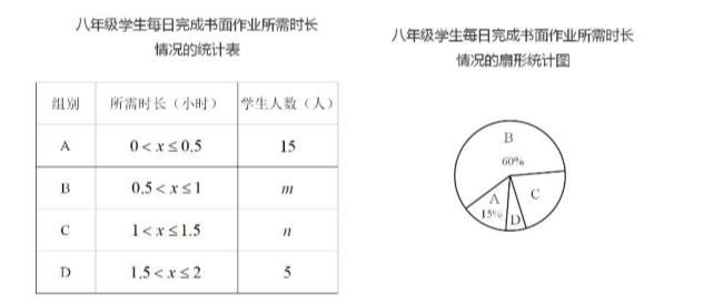 双减政策实施后, 学校为了解八年级学生每日完成书面作业所需时长 $x$ (单位: 小时) 的情况, 在全校范围内 随机抽取了八年级若干名学生进行调查, 并将所收集的数据分组整理, 绘制了如下两幅不完整的统计图表, 请 根据图表信息解答下列问题.