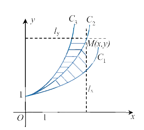 如图, $C_1$ 和 $C_2$ 分别是 $y=\frac{1}{2}\left(1+e^x\right)$ 和 $y=e^x$ 的图象,过点 $(0,1)$ 的曲线 $C_3$ 是一单调增函数的图象. 过 $C_2$ 上任一点 $M(x, y)$ 分别作垂直于 $x$ 轴和 $y$ 轴的直线 $l_x$ 和 $l_y$. 记 $C_1, C_2$与 $l_x$ 所围图形的面积为 $S_1(x) ; C_2, C_3$ 与 $l_y$ 所围图形的面积为 $S_2(y)$. 如果总有 $S_1(x)=S_2(y)$ ,求曲线 $C_3$ 的方程 $x=\phi(y)$.