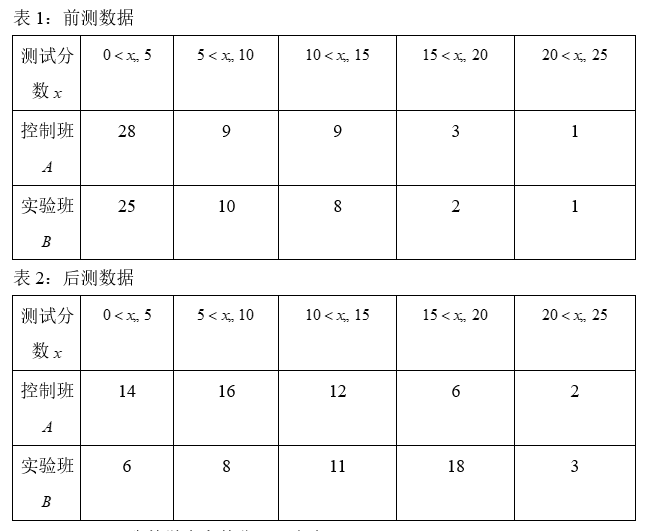 为了改进几何教学,张老师选择 A,B 两班进行教学实验研究,在实验班B 实施新的教学方法,在控制班A 采用原来的教学方法.在实验开始前,进行一次几何能力测试(前测,总分25分),经过一段时间的教学后,再用难度、题型、总分相同的试卷进行测试(后测),得到前测和后测数据并整理成表1和表2.