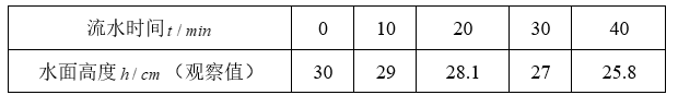 【建立模型】小组讨论发现: " $t=0, h=30$ " 是初始状态下的准确数据, 水面高度值的变化不均匀, 但可以用一次函数近似地刻画水面高度 $h$ 与流水时间 $t$ 的关系。