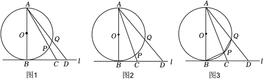 我们可以通过中心投影的方法建立圆上的点与直线上点的对应关系,用直线上点的位置刻画圆上点的位置.如图,$AB$ 是$\ \odot O$ 的直径,直线$l$是$\ \odot O$ 的切线,$B$ 为切点.$P$ ,$Q$ 是圆上两点(不与点 重合,且在直径 的同侧), 分别作射线 $A P$, $A Q$ 交直线 $l$ 于点 $C$, 点 $D$.