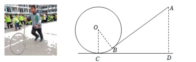 为弘扬民族传统体育文化, 某校将传统游戏 “滚铁环” 列入了校运动会的比赛项日. 滚铁环器材山铁环和推杆组成. 小明对滚铁环的启动阶段进行了研究, 如图, 滚铁环时, 铁环 $\odot O$ 与水平 地面相切于点 $C$, 推杆 $A B$ 与铅垂线 $A D$ 的夹角为 $\angle B A D$, 点 $O, A, B, C, D$ 在同一平面内. 当推杆 $A B$ 与铁环 $\odot O$ 相切于点 $B$ 时, 手上的力量通过切点 $B$ 传递到铁环上,会有较好的启动效果.