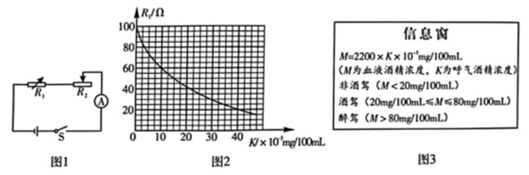 呼气式酒精测试仪中装有酒精气体传感器, 可用于检测驾驶员是 否酒后驾车, 酒精气体传感器是一种气敏电阻(图 1 中的 $R_1$ ), $R_1$ 的阻值随呼气酒精浓度 $K$ 的变化而变化 (如图 2), 血液酒精浓 度 $M$ 与呼气酒精浓度 $K$ 的关系见图 3.下列说法不正确的是