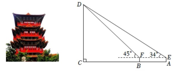 开封清明上河图是依照北宋著名画家张择端的《清明上河图》建 造的, 拂云阁是园内最高的建筑, 某数学小组测量拂云阁 DC 的高度 如图, 在 $A$ 处用测角仪测得拂云阁顶端 $\mathrm{D}$ 的仰角为 $34^{\circ}$, 沿 $\mathrm{AC}$ 方 向前进 $15 \mathrm{~m}$ 到达 $B$ 处, 又测得拂云阁顶端 $\mathrm{D}$ 的仰角为 $45^{\circ}$. 已知测 角仪的高度为 $1.5 \mathrm{~m}$, 测量点 $A, B$ 与拂云阁 $D C$ 的底部 $C$ 在同一水 平线上, 求拂云阁 DC 的高度(结果精确到 $1 \mathrm{~m}$. 参考数据: $\sin 34^{\circ}$ $\left.\approx 0.56, \cos 34^{\circ} \approx 0.83, \tan 34^{\circ} \approx 0.67\right)$