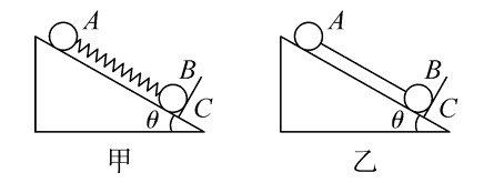 如图,$A 、 B$ 两球质量相等,光滑斜面的倾角为 $\theta$ ,图甲中,$A 、 B$ 两球用轻弹簧相连,图乙中 $A 、 B$ 两球用轻质杆相连,系统静止时,挡板 $C$与斜面垂直,弹簧、轻杆均与斜面平行,则在突然撤去挡板的瞬间