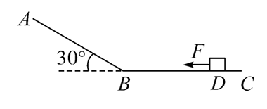 光滑斜面 $A B$ 与一粗糙水平面 $B C$ 连接,斜面倾角 $\theta=30^{\circ}$ ,质量 $m=2 \mathrm{~kg}$ 的物体置于水平血上的 $D$ 点,$D B$ 间的距离 $d=7 \mathrm{~m}$ ,物体与水平面间的动摩擦因数 $\mu=0.2$ ,将一水平向左的恒力 $F=8 \mathrm{~N}$ 作用在该物体上, $t=2 \mathrm{~s}$ 后撤去该力,不考虑物体经过 $B$ 点点时的速度损失。求撤去拉力 $F$ 后,经过多长时间物体经过 $B$ 点?