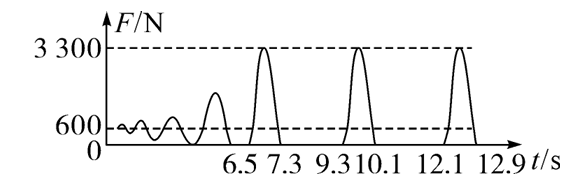 蹦床属于体操运动的一种,有"空中芭蕾"之称。某次比赛过程中,一运动员做蹦床运动时,利用力传感器测得运动员所受蹦床弹力 $F$ 随时间 $t$ 的变化图像如图所示。若运动员仅在坚直方向运动,不计空气阻力,取重力加速度大小 $g=10 \mathrm{~m} / \mathrm{s}^2$ ,依据图像给出的信息,下列说法正确的是