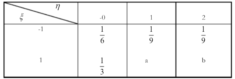 设 $(\xi, \eta)$ 的联合分布律如表所示, 则 $(\mathrm{a}, \mathrm{b})=(\quad)$ 时, $\xi$ 与 $\eta$ 相互独立。