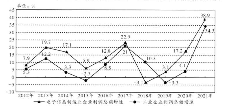 下图为 2012 年一2021 年我国电子信息制造业企业和工业企业利润总额增速情况折线图.