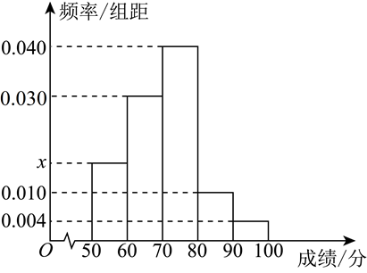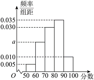 在某市高三年级举行的一次模拟考试中,某学科共有 20000 人参加考试。为了了解本次考试学生成绩情况,从中抽取了部分学生的成绩(成绩均为正整数,满分为 100 分)作为样本进行统计,样本容量为 $n$ ,按照 $[50,60)$ , $[60,70),[70,80),[80,90),[90,100]$ 的分组作出频率分布直方图如图所示.其中,成绩落在区间 $[50,60)$ 内的人数为 16.则下列结论正确的是( )