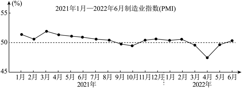 采购经理指数(PMI),是通过对企业采购经理的月度调查结果统计汇总、编制而成的指数,它涵盖了企业采购、生产、流通等各个环节,包括制造业和非制造业领域,是国际上通用的检测宏观经济走势的先行指数之一,具有较强的预测、预警作用.制造业PMI高于 时,反映制造业较上月扩张;低于 ,则反映制造业较上月收缩.下图为我国2023年1月—2023年6月制造业采购经理指数(PMI)统计图.