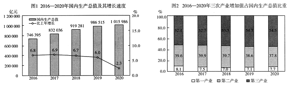 2021年2月28日国家统计局发布了《2020年国民经济和社会发展统计公报》,全面展示了一年来全国人民顽强奋斗取得的令世界瞩目、可载入史册的伟大成就,来之不易,催人奋进.如图是2016-2020年国内生产总值(单位:亿元)及其增长速度走势图和三次产业增加值占国内生产总值比重图,据图可知下列说法正确的是