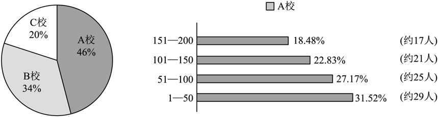 $\text{A.}$ 测试成绩前 200 名学生中 $B$ 校人数超过 $C$ 校人数的 1.5 倍 $\text{B.}$ 测试成绩前 100 名学生中 $A$ 校人数超过一半以上 $\text{C.}$ 测试成绩在 51-100 名学生中 $A$ 校人数多于 $C$ 校人数 $\text{D.}$ 测试成绩在 101—150 名学生中 $B$ 校人数最多 29 人
