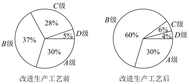 某公司生产的一种产品按照质量由高到低分为A,B,C,D四级,为了增加产量、提高质量,该公司改进了一次生产工艺,使得生产总量增加了一倍.为了解新生产工艺的效果,对改进生产工艺前、后的四级产品的占比情况进行了统计,绘制了如下扇形图: