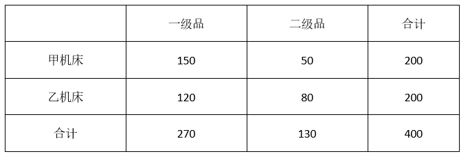 甲、乙两台机床生产同种产品,产品按质量分为一级品和二级品,为了比较两台机床产品的质量,分别用两台机床各生产了200件产品,产品的质量情况统计如下表: