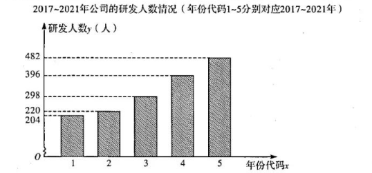 (1)根据条形统计图中数据, 计算该公司研发人数 $y$ 与年份代码 $x$ 的相关系数 $r$, 并由 此判断其相关性的强弱;