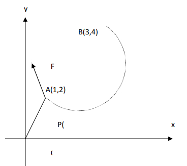 质点 $P$ 沿着以 $A B$ 为直径的半圆周, 从点 $A(1,2)$ 运动到点 $B(3,4)$ 的过程中受变力 $F$ 作用(见图)。 $F$ 的大小等于 点 $P$ 与原点 $O$ 之间的距离, 其方向垂直于线段 $O P$ 且与 $y$ 轴正向的夹角小于 $\frac{\pi}{2}$, 求变力 $F$ 对质点 $P$ 所作的功
