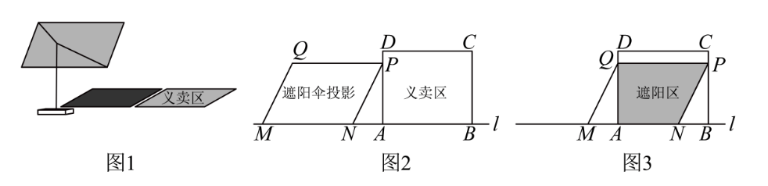 树人中学组织一次"爱心义卖"活动.九(5)班分配到了一块矩形义卖区和一把遮阳伞,遮阳伞在地面上的投影是一个平行四边形(如图 1)