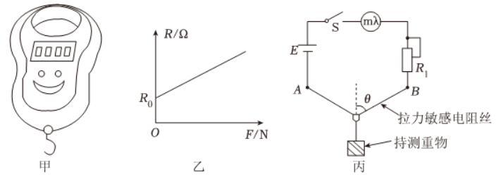 物理小组找到一根拉力敏感电阻丝 $R_L$, 其阻值随拉力 $F$ 变化的图像如图乙所示, 小组按图丙所示电路制作了一个简易“吊秤“。电 路中电源电动势 $E=3 \mathrm{~V}$, 内阻 $r=1 \Omega$ ;灵敏毫安表量程为 $10 \mathrm{~mA}$, 内阻 $R_g=50 \Omega ; R_1$ 是可变电阻器, $A 、 B$ 两接线柱等高且固定。现将这根拉力敏感电阻丝套上轻质光滑绝缘环, 将其两端接在 $A 、 B$ 两接线柱之间固定不动, 通过光滑绝缘滑环可将重物吊起, 不计敏感电阻丝重力, 现完成下列操作步聚: