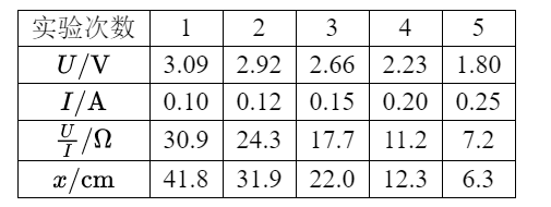 (2)他们用改进后的电路进行了实验, 同时记录电压表的示数 $U$ 、电流表的示数 $I$ 及对 应的 $P N$ 的长度 $x$, 部分实验数据如下: