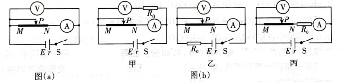(1) 图 (a) 中, $E$ 是无人机的电池, $M N$ 是他们从“热得快” 中拆下的一段粗细均匀的电热 丝。选择适当的电表量程后, 他们发现大范围移动滑片 $P$, 电压表的示数变化却不明显。 为解决这一问题, 他们在讨论后将 $R_0=8.40 \Omega$ 的定值电阻接人电路中, 那么, 选择图 (b) 中 的电路 ( ) (选填“甲”“乙”或“丙”) 可解决这一问题;