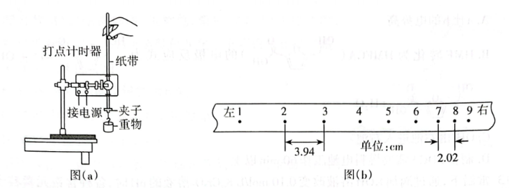 在测量当地的重力加速度时, 按图 (a)所示将打点计时器固定在铁架台上, 重物连上纸 带, 纸带穿过打点计时器后接通电源, 释放纸带, 打出的纸带如图 (b) 所示, 图中 $1 \sim 9$ 是依 次标记的计时点。