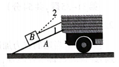 借助木板从卡车上往地面卸货时, 长木板 $A$ 表面粗䊁, 一端放在卡车车相的底板上, 另 一端置于水平地面上。将小货箱 $B$ 从车厢底板推到木板上, 用平行于 $A$ 绳拉 $B$, 可使 $B$ 沿 $A$ 匀速下滑; 若改用与 $A$ 成一定的角度绳拉 $B$, 同样可使 $B$ 沿 $A$ 匀速下滑。已知 $A$ 始终 保持静止, 则在两次 $B$ 沿 $A$ 下滑的过程中