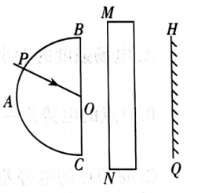 如图所示, 自左向右依次固定放置半圆形玻璃砖、长方体玻璃砖和光屏, $B C 、 M N 、 H Q$ 三 个表面相互平行。一线光源紧贴玻璃砖表面以 $O$ 为圆心沿 $B A C$ 移动, 线光源发出的白 光始终正对圆心 $O$ 射人玻璃砖, 经长方体玻璃砖后打在光屏上。 $P$ 是 $B A C$ 上的一点, 不考虑光在各个界面的反射, 则光源