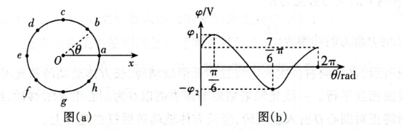 纸面内存在沿某方向的匀强电场。在电场中取 $O$ 点为坐标原点建立 $x$ 轴, 以 $O$ 为圆心、 $R$ 为半径, 从 $x$ 轴上的 $a$ 点开始沿逆时针方向作圆, $a \sim h$ 是圆周上的 8 个等分点, 如图 (a) 所示; 测量圆上各点的电势 $\varphi$ 与半径同 $x$ 轴正方向的夹角 $\theta$, 描绘的 $\varphi-\theta$ 图像如图 (b)所示,下列说法正确的是
